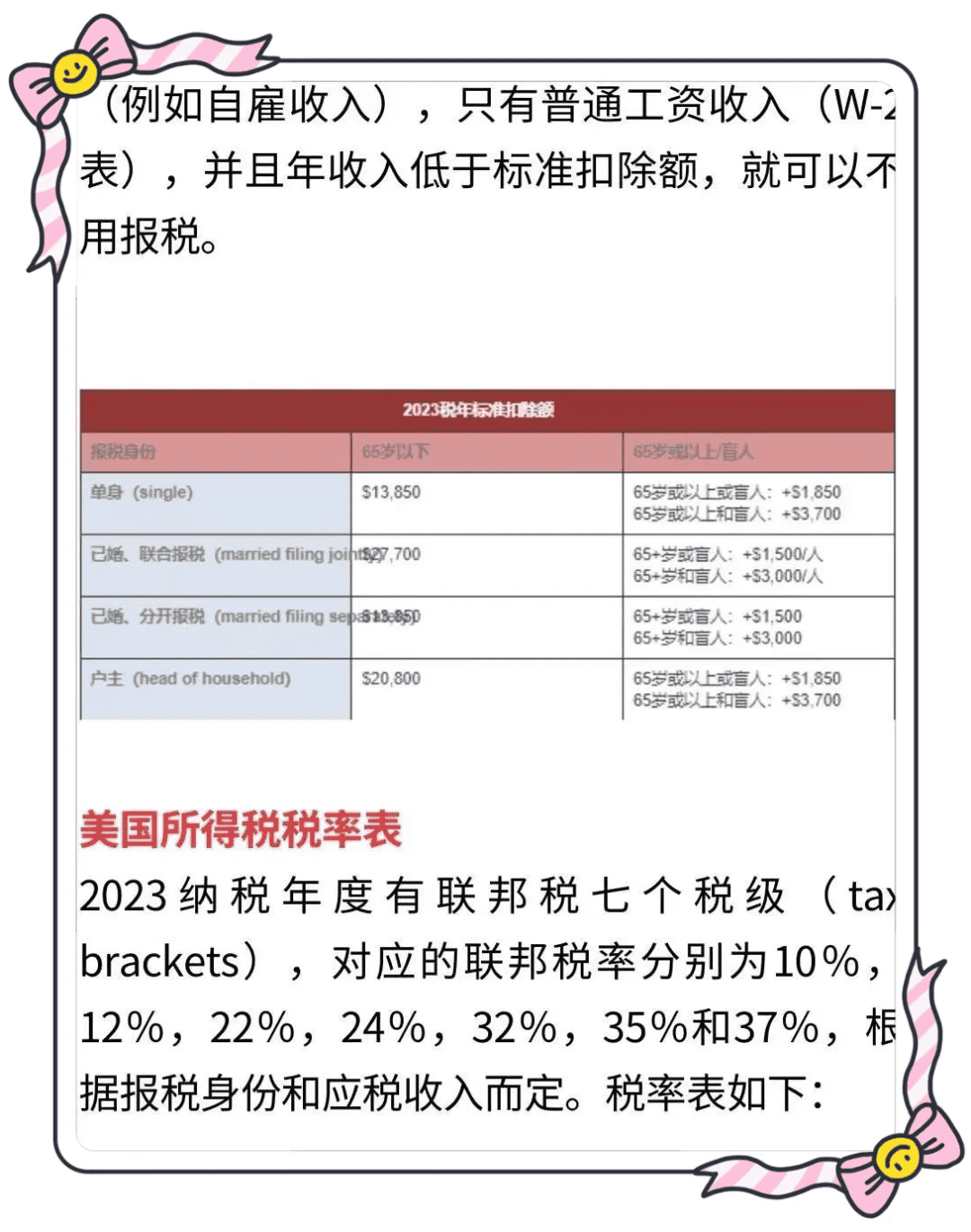 – **免税**:某些收入类型或情况下不需要纳税。