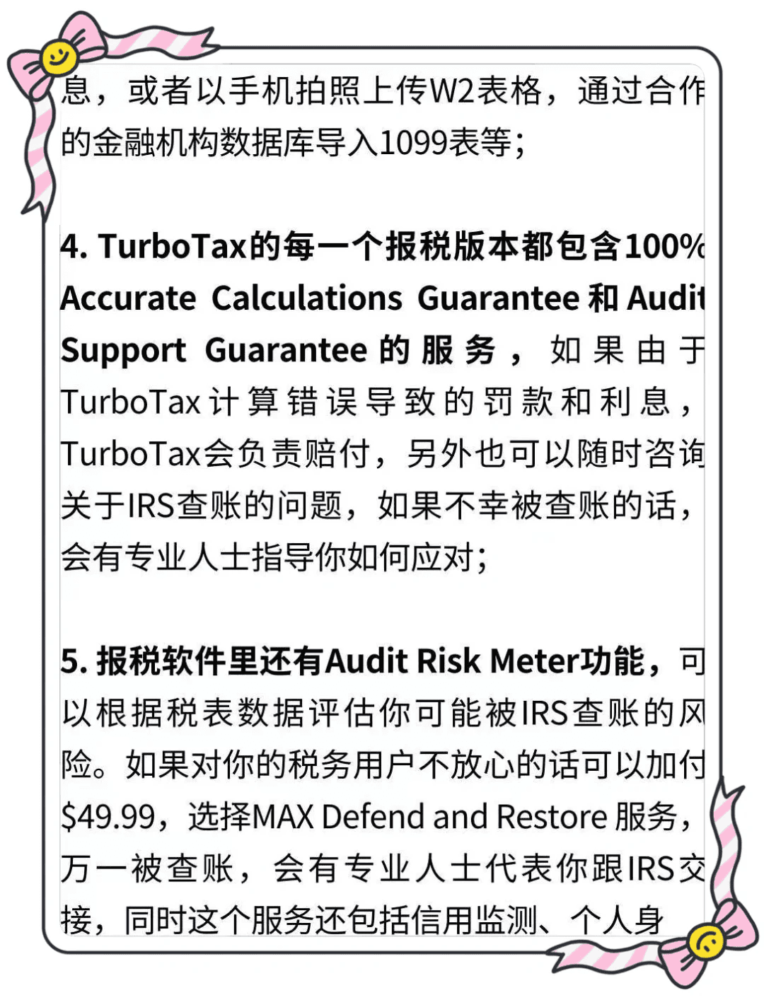 6. **准确性保证**:确保软件提供准确性保证。TurboTax和TaxAct都提供100%准确性保证,如果由于软件的过错导致客户收到IRS的罚款或利息,他们会进行赔偿 。