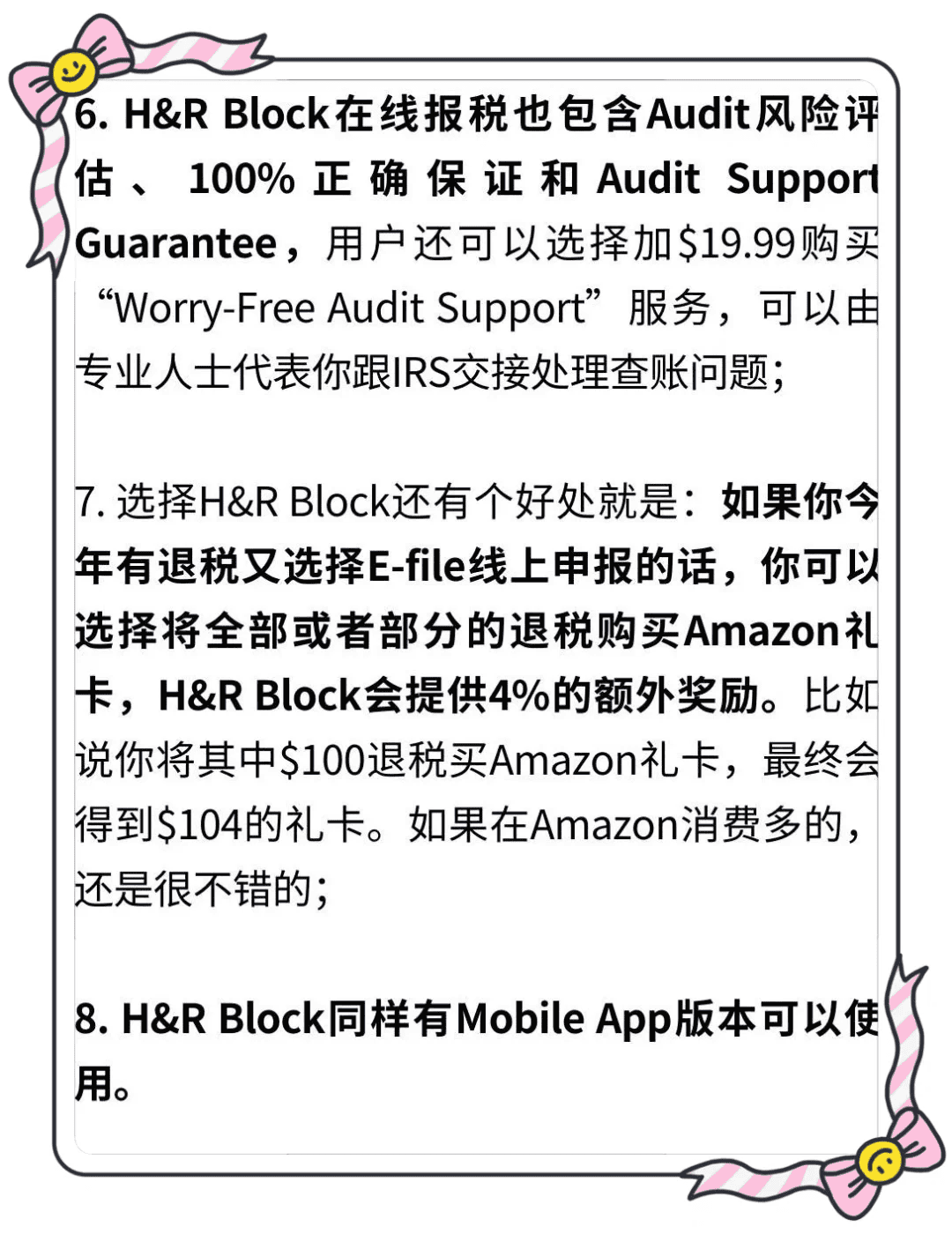 9. **品牌信誉**:选择知名品牌,如H&R Block,它不仅提供在线服务,还有遍布美国的实体店提供面对面服务 。