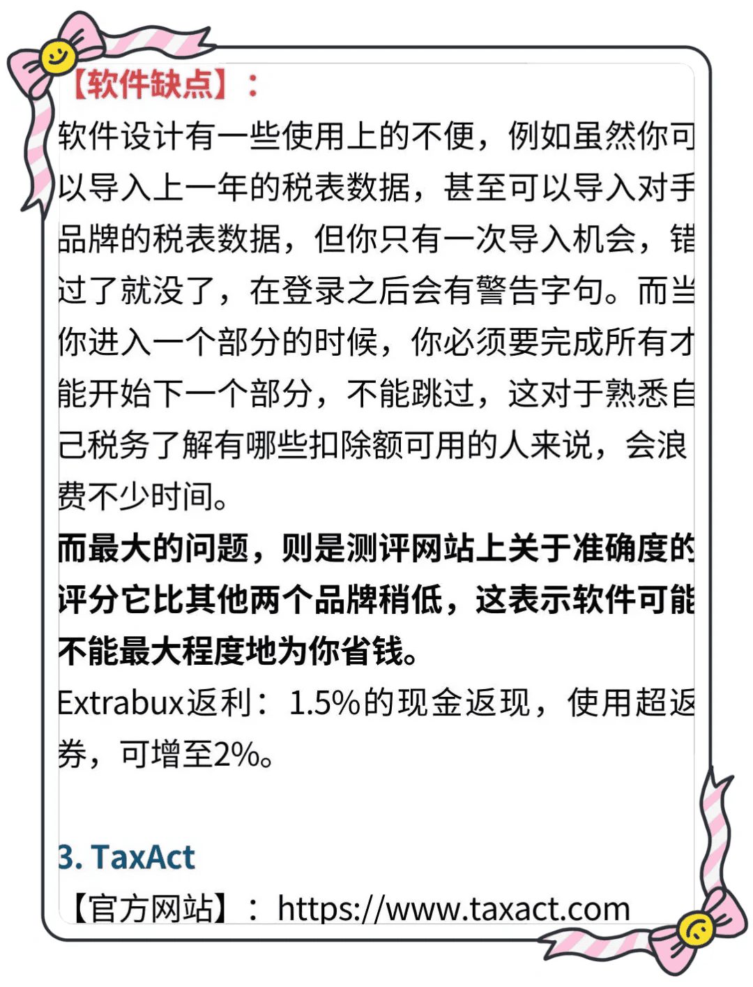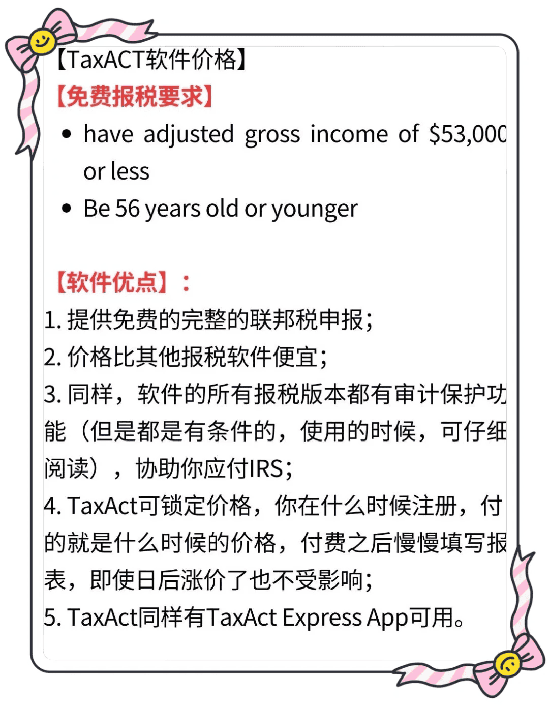 – **特点**:高准确性,如果因TaxAct的过错导致客户收到IRS罚款或利息,最高赔偿$100,000。