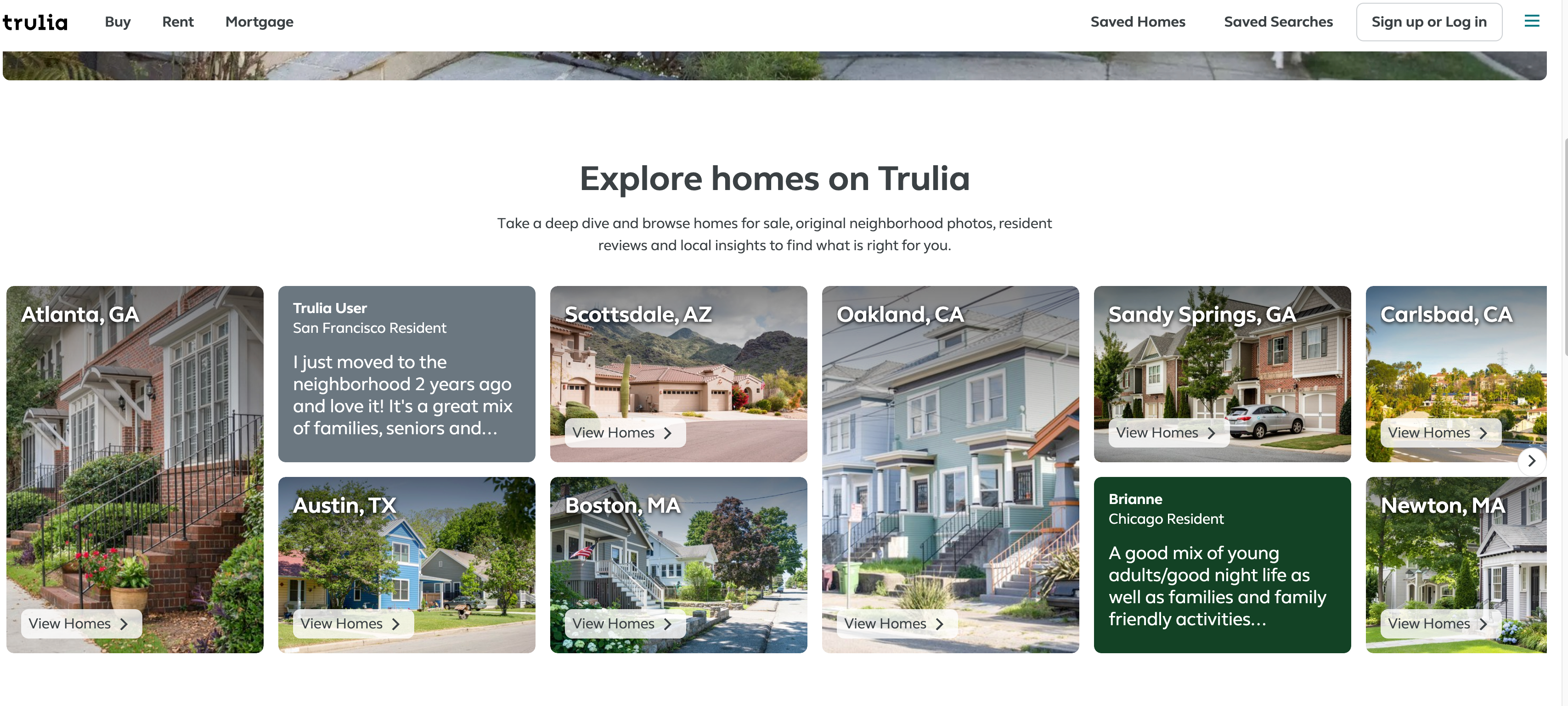 Trulia成立于2005年,是一个“面向购房者和租房者的住宅和社区网站”,它不仅提供可供出售和出租的房产的常见清单,还添加了一些与邻里相关的信息,比如通勤时间、犯罪报告、学校、附近的企业等等。Trulia总部位于加州旧金山,2012年上市,2015年被竞争对手