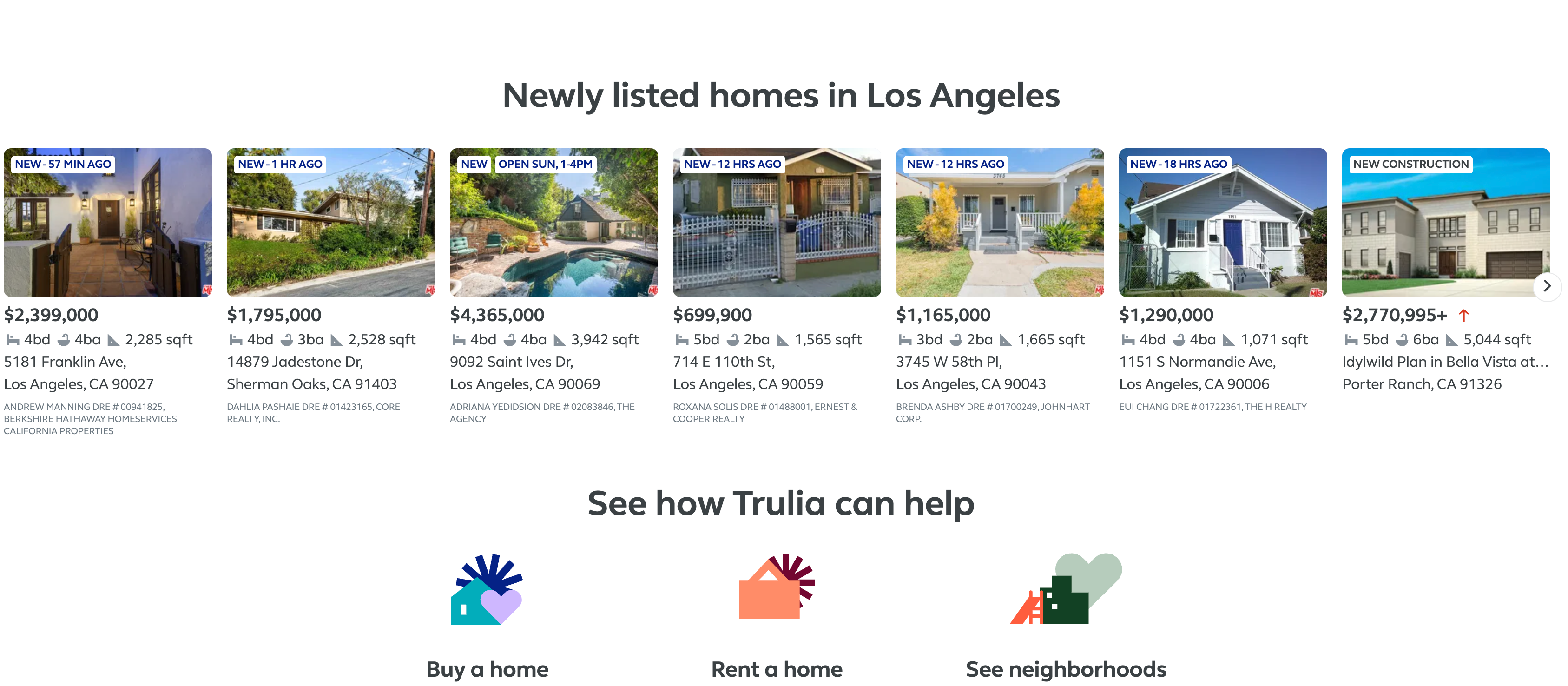 Trulia是一个专注于提供房源和社区信息的网站,它拥有超过300万的房源,包括公寓、独栋房屋、联排别墅、工作室等。你可以在 Trulia 上搜索和筛选你想要的房源,根据你的需求和偏好,找到最适合你的房源。你还可以在 Trulia 上查看房源的详细信息、照片、视频、地图、历史数据等,还可以看到房源周边的社区信息,如邻居、学校、犯罪率、交通、娱乐等,让你能够全面地了解你的未来居住环境。你还可以在 Trulia 上直接和房东联系,预约看房,申请和签约。Trulia 不收取任何中介费或服务费,所有的房源都是经过验证和更新的,保证了房源的真实性和质量。Trulia同时也是Zillow的子公司。